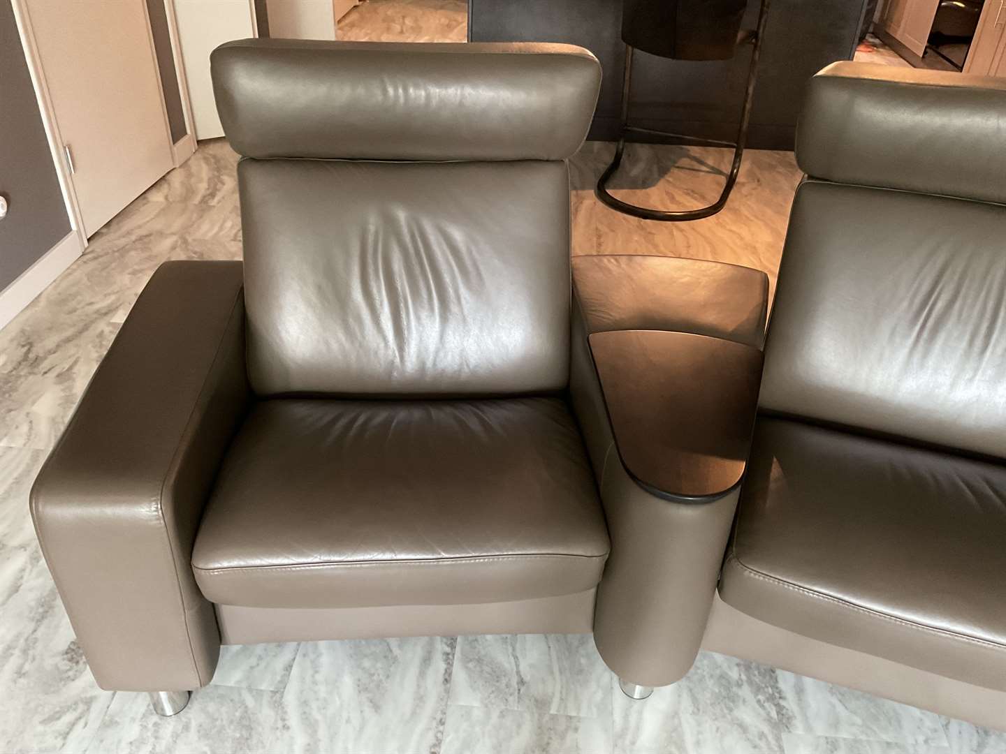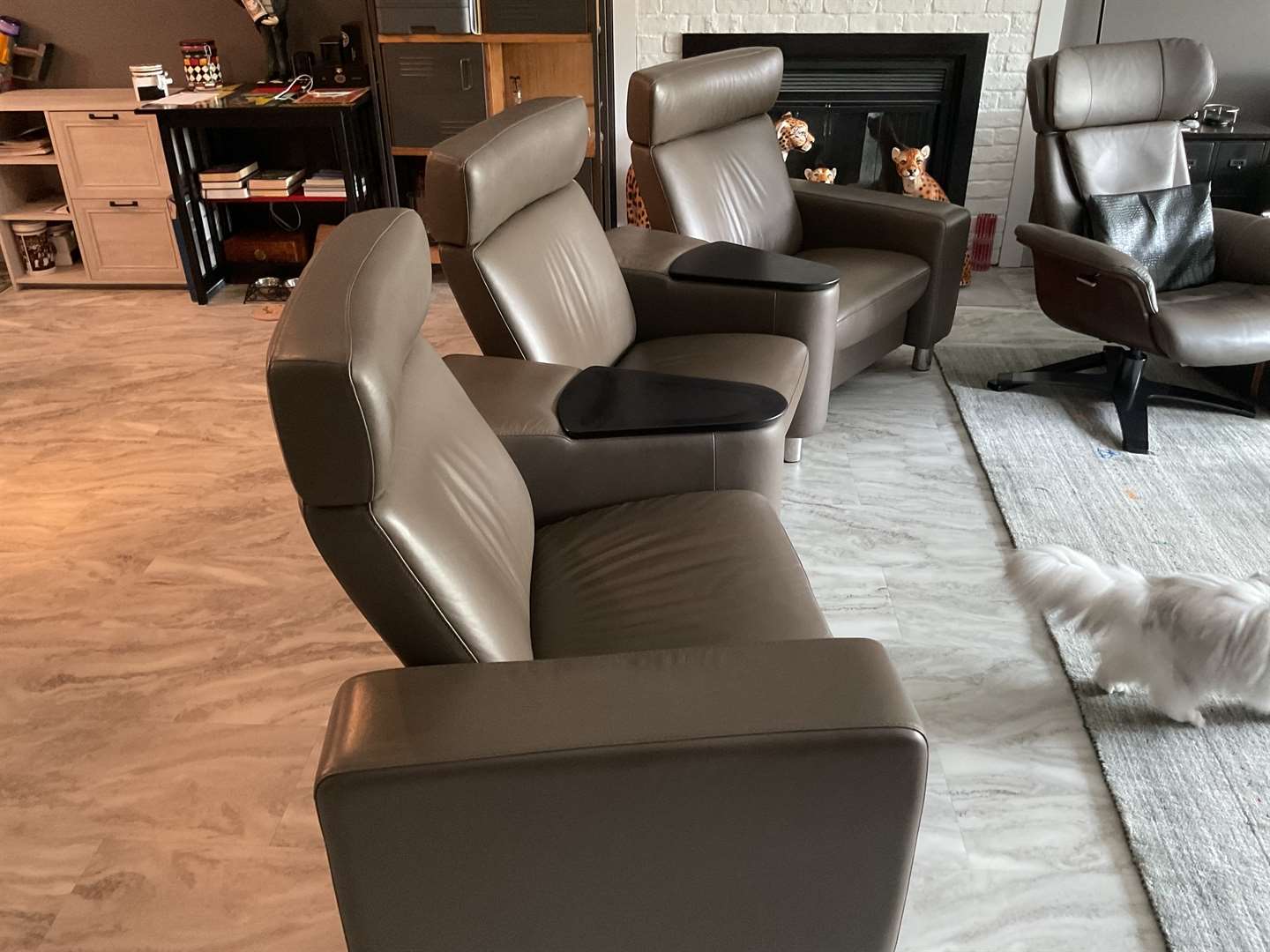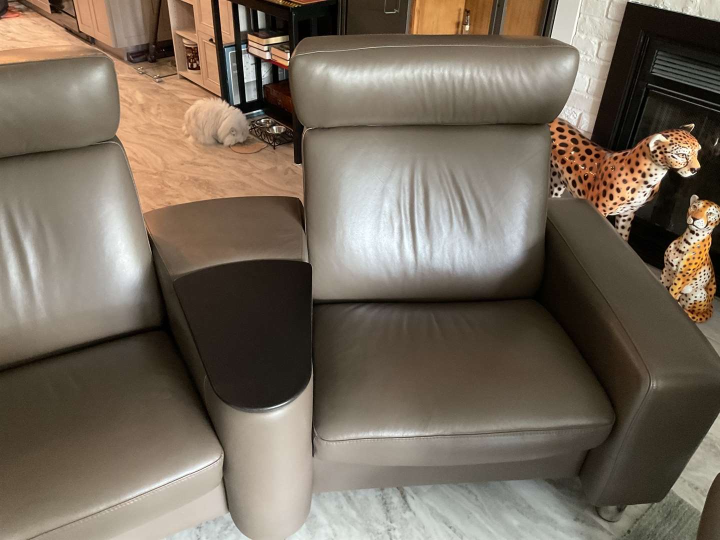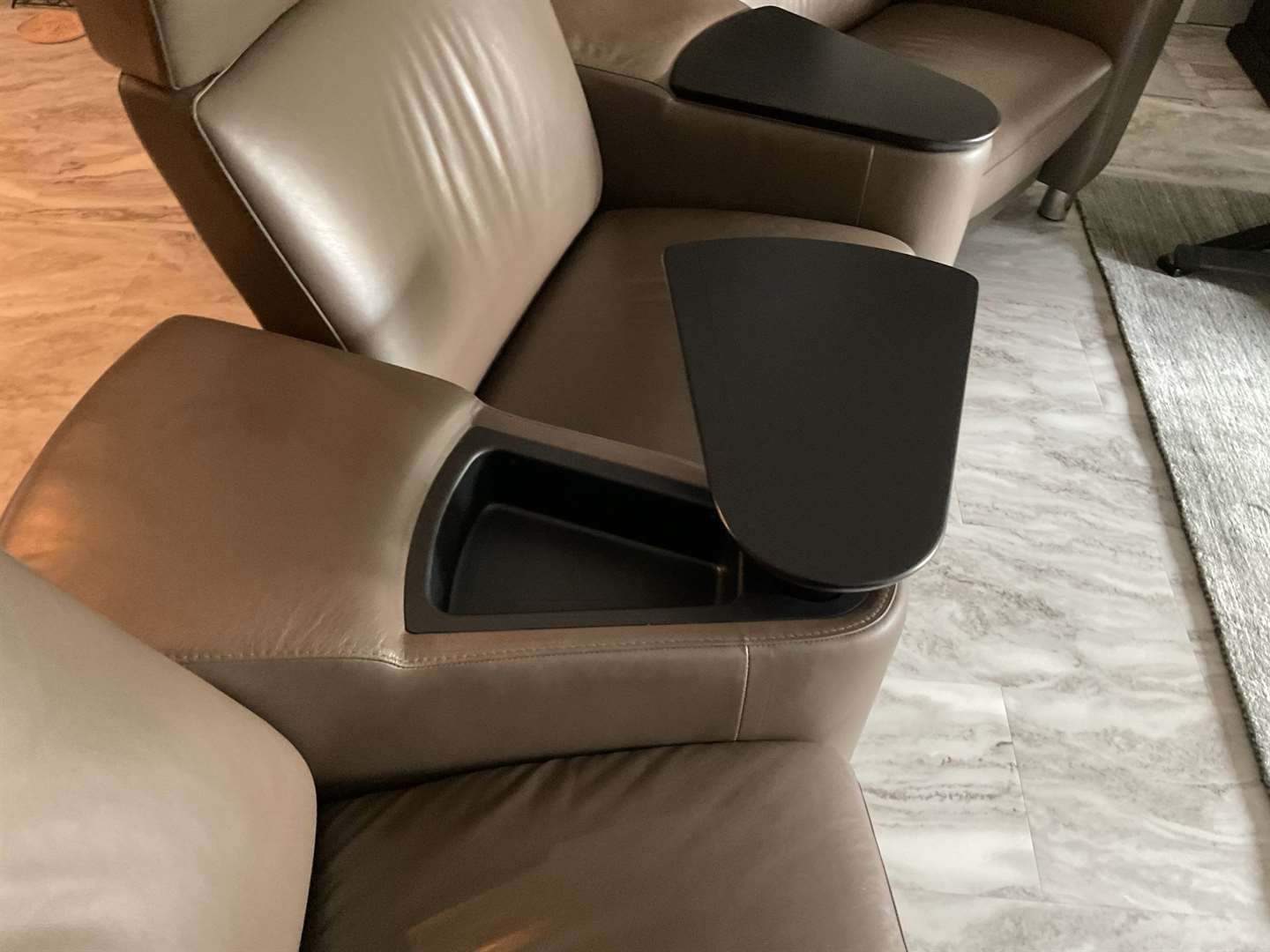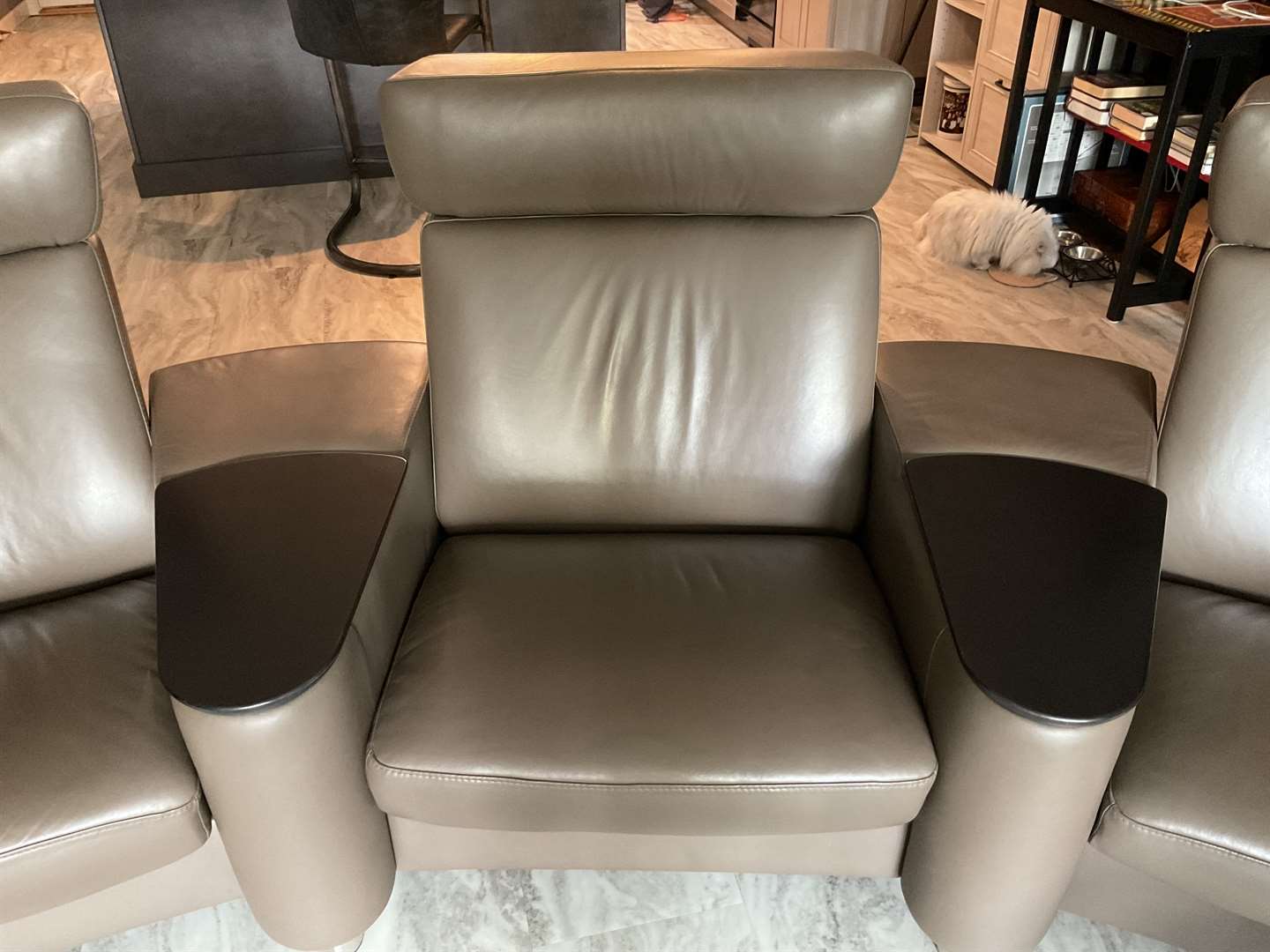 111” by 53”D curved three seat in premium leather sectional with storage in arms and wooden cover doubling as end tables in Khaki color. This was a special order, premium leather from Norway. Seat backs recline slightly but there are no foot rests. $800 or BO. Call to make an appointment @ 605 2513724. Pick up only. Cash only. Each section and end tables can disconnect for easy transport and moving.