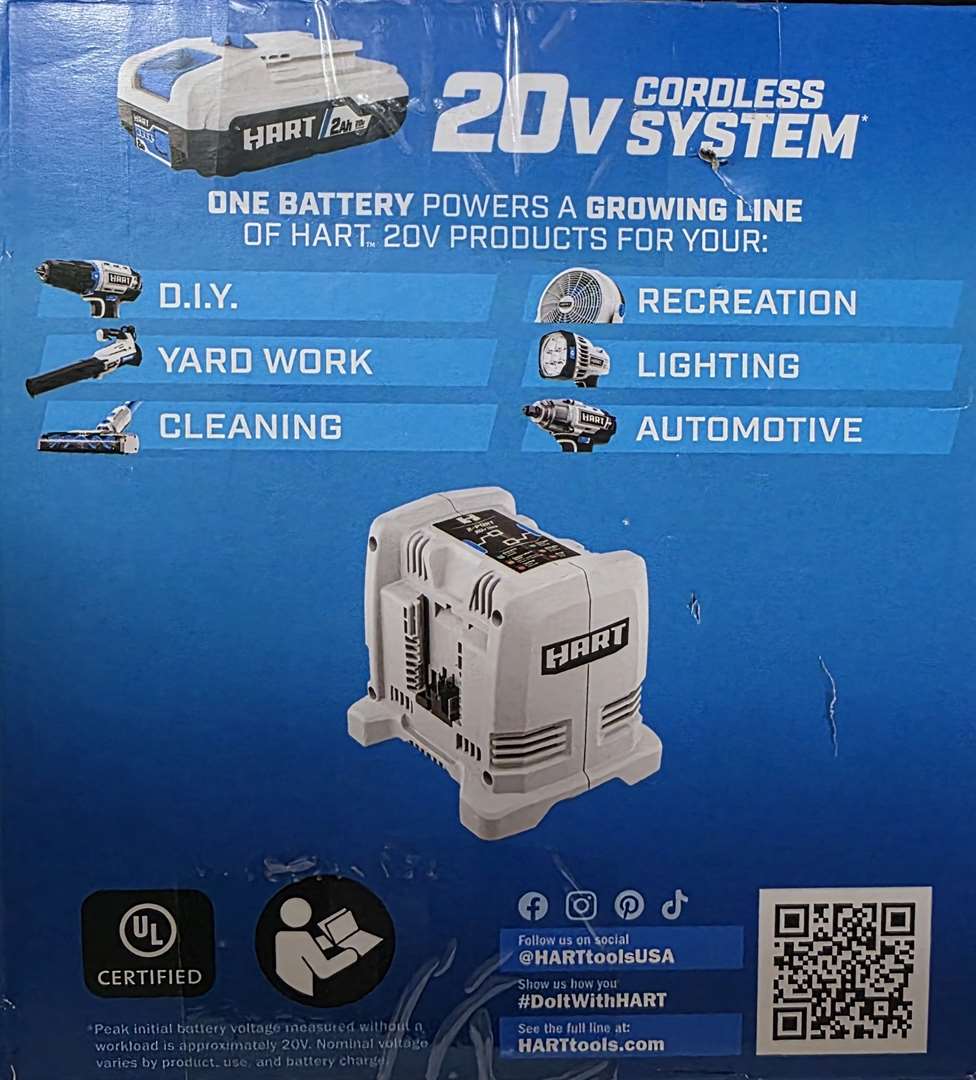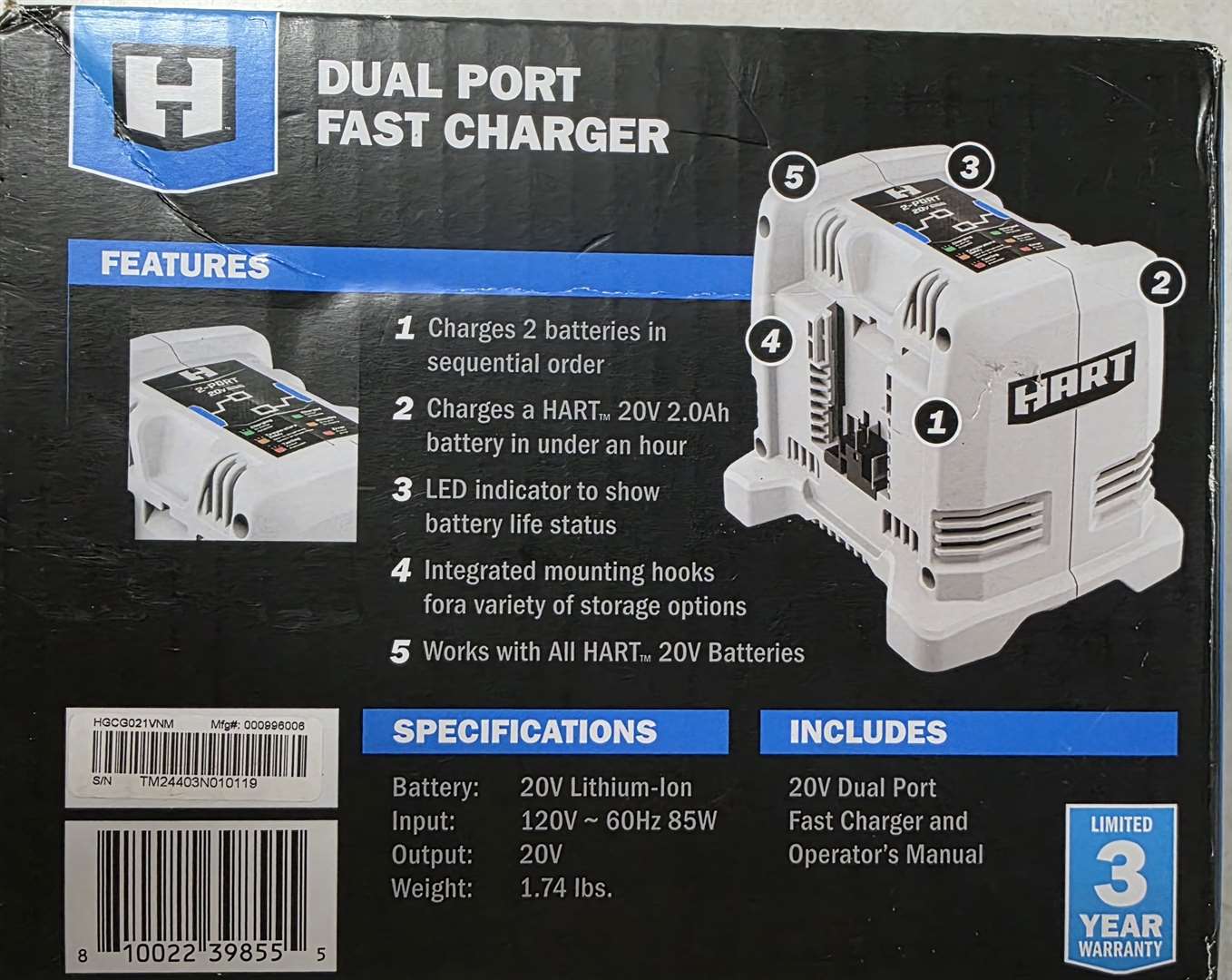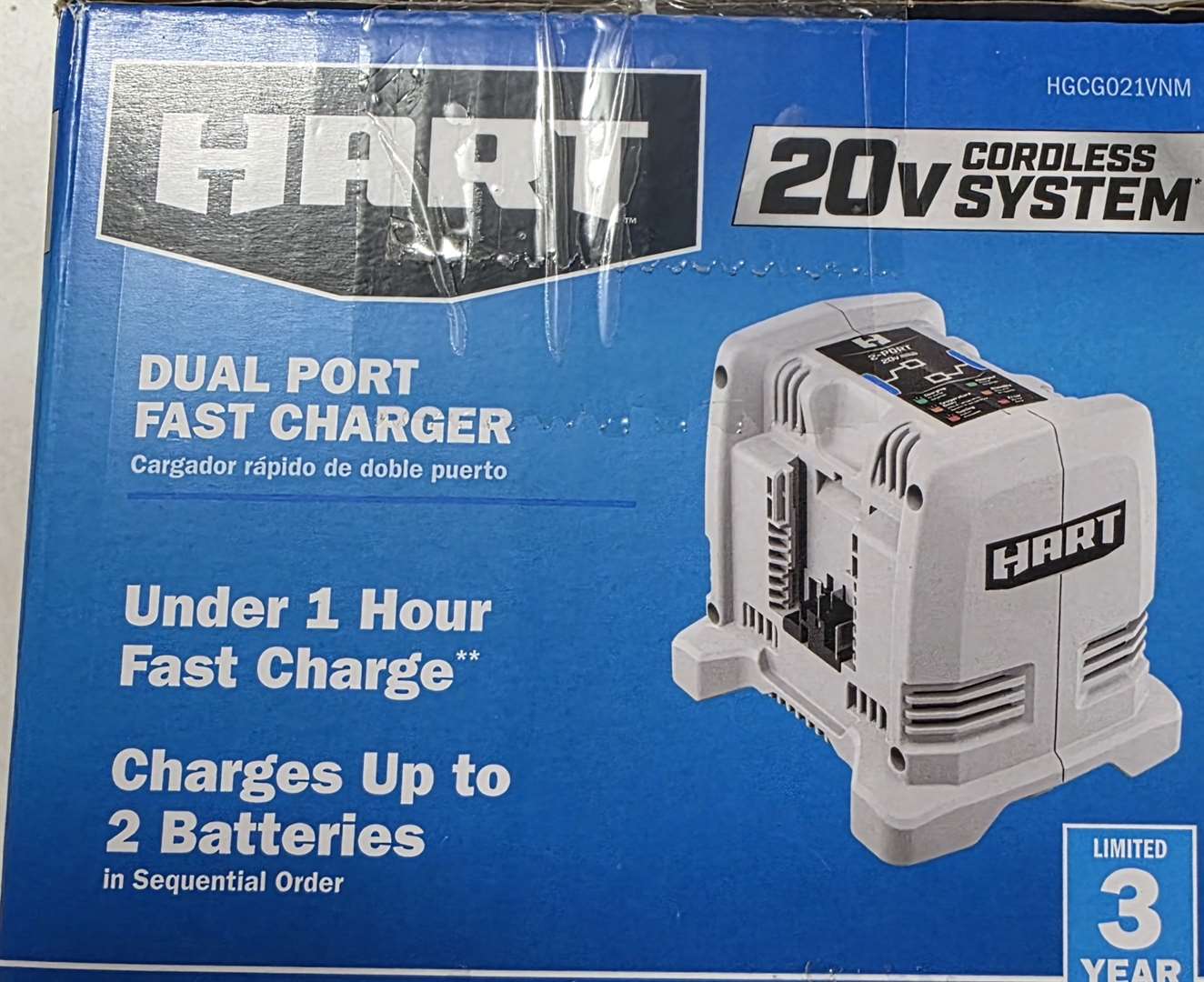 Hart 20Volt Dual Port Fast Charger. Under 1 Hour Fast Charge. Charges up to 20V 2.0Ah Batteries. Works with ALL HART 20V Batteries. If you are interested Email me.