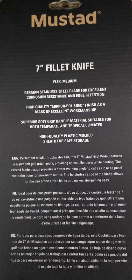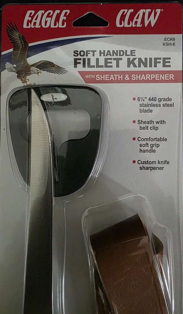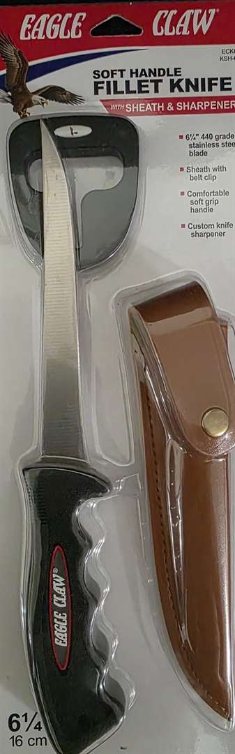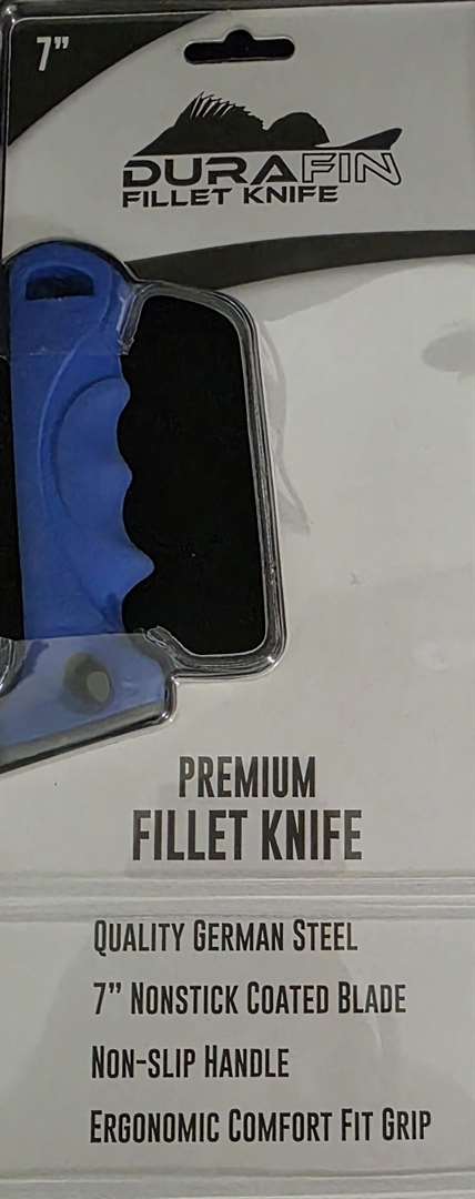 Fish Fillet Knives. 3 Each to Choose From. 7 Inch and 6 1/2 Inch. 1. Eagle Claw Soft Handle Fillet Knife with Sheath and Sharpener 6 1/4 Inch Blade. $10. 2. Durafin Premium Fillet Knife Quality German Steel with 7 Inch Nonstick Coated Blade. $15 3. Mustad 7 Inch Knife with German Stainless Steel and Superior Soft Grip. $20. If Interested Email me.