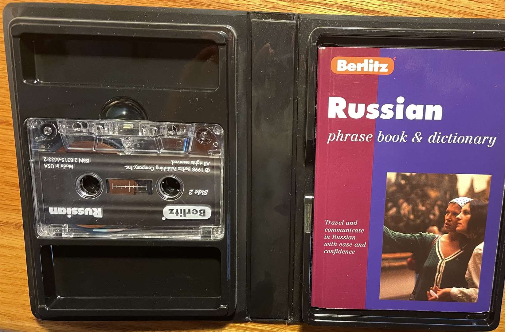 Berlitz Russian language learning tool. The package includes a cassette (I've also put the content of the cassette on a CD that will be included as well) and a small paperback phrasebook and dictionary. I found it very useful when I went on a business trip to Moscow ages ago. I listened to the cassette on the flight over and learned enough Russian to get by for a week, but I'm a slow learner. The phrase book came in very handy as well. Asking $15 OBO