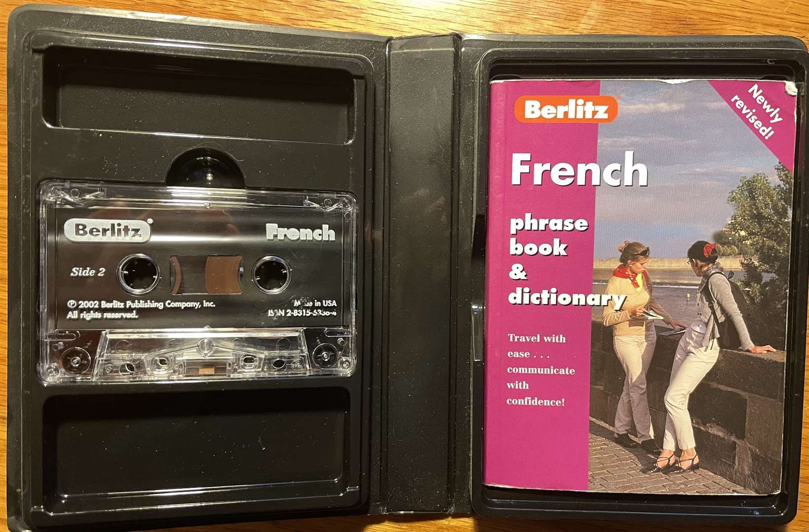 Berlitz French language learning tool. The package includes a cassette (I'm putting the content of the cassette on a CD that will be included as well) and a small paperback phrasebook and dictionary. I found it very useful when I went on a "why not?" trip to Paris ages ago. I listened to the cassette on the flight over and learned enough French to get by for a week, but I'm a slow learner. The phrase book came in very handy as well - I used it to good effect when I had to go out and buy something or eat at a restaurant. Asking $15 OBO