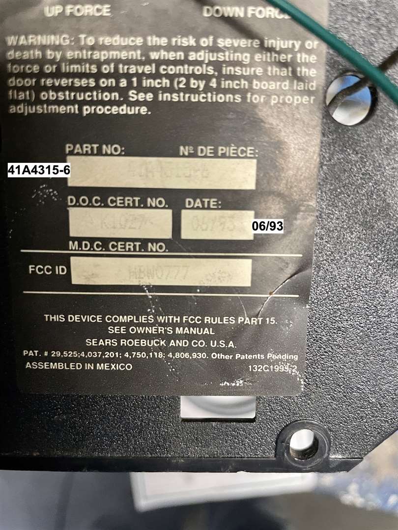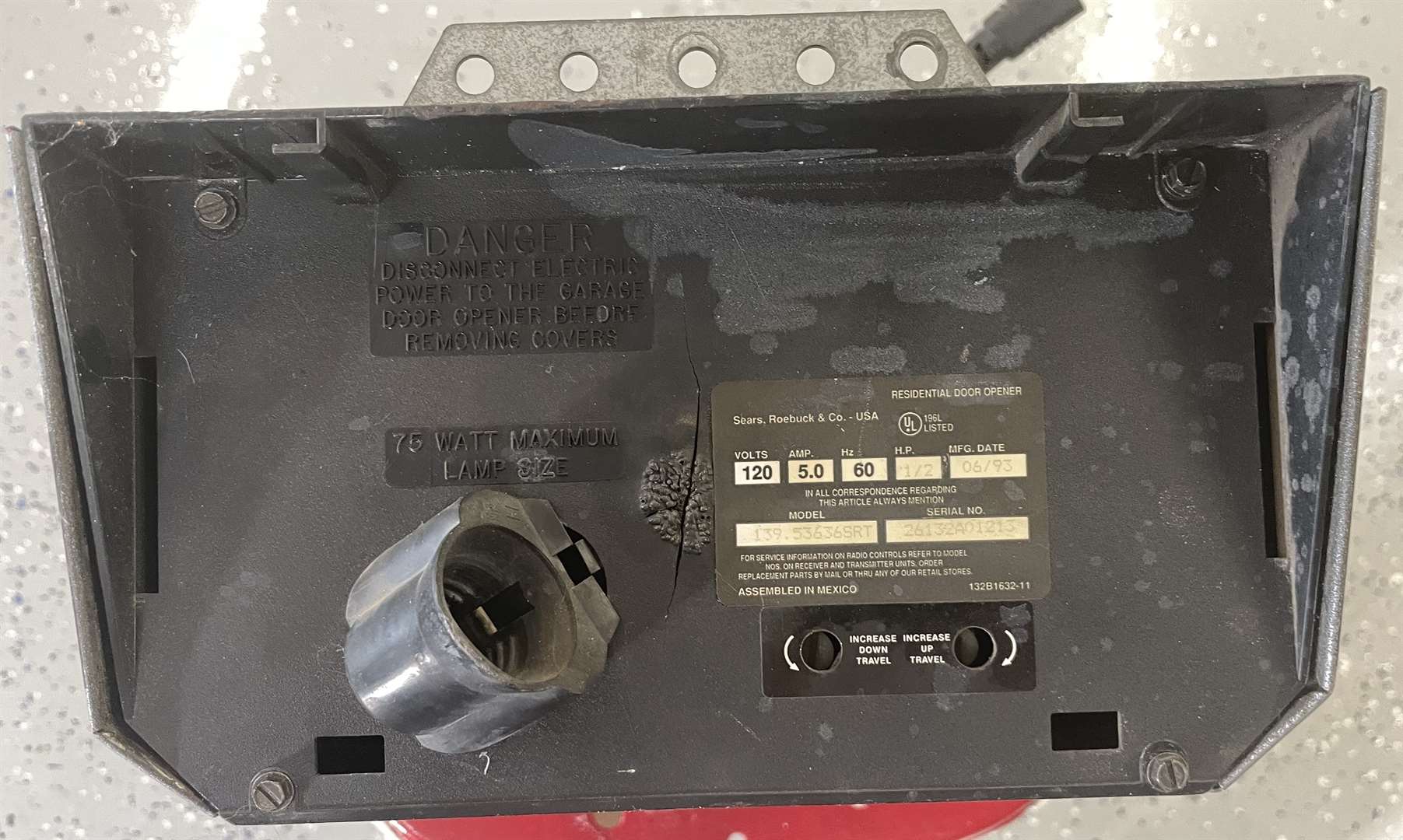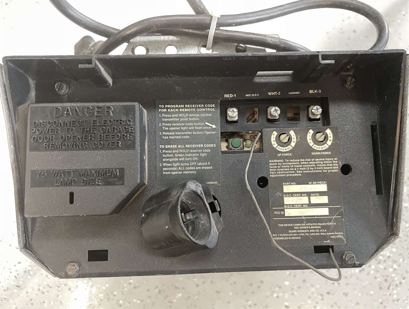 Selling a 1/2 Horsepower chain drive opener Chamberlain model 41A4315-6, Sears model 139.53636SRT. Does not include the light covers, chain, rail, brackets or safety sensors. Works with wireless remotes compatible with the green programming button openers, as well as using hard-wired switches (like doorbell switches). This was given to me as inoperable and I found the nylon gear stripped inside. It's been replaced, the unit cleaned and lubricated, and checked out. I'm only hoping to get back what I have in it.
