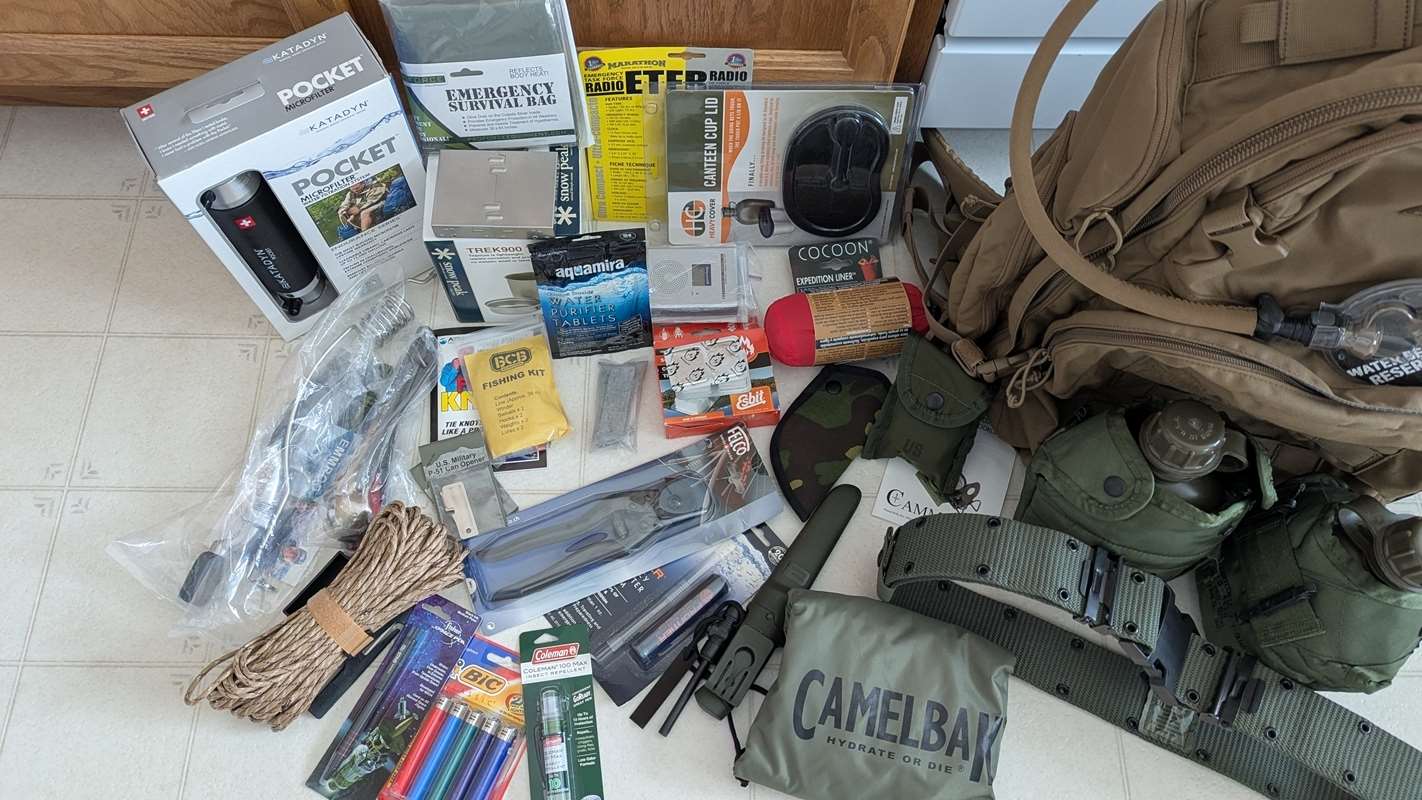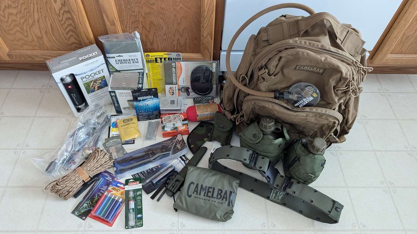 EVERYTHING is NEW! Local sales only. Over $1000 worth of gear. 605-681-6575 Please text, call, or email with any questions. Camelbak BFM 46L Backpack, Camelbak Rain Cover, Snow Peak Trek900 Ti Cookset, ETFR Radio and Antenna, Katadyn 8013618 Filter, Aquamira Frontier Straw, Aquamire Water Purifier Tablets, Felco CDO Wirecutter, Esbit Type Stove, 18 pcs Solid Fuel Cubes, Optimus Titanium Cutlery, Fishing Kit, Emmrod Compact Fishing Rod- No reel, Morakniv Companion Heavy Duty Carbon Knife, Cocoon Expedition Liner 100% Ripstop Silk, Cammenga 27 Phosphorescent Compass, Emergency Survival Bag, 2 P-51's Firestarters, Space Pen, Bic Lighters, Bug Repellent, WK skinning knife, 100' 550 Survival Paracord, GI Utility Belt, 2- GI Canteens w/Covers and Cups 1- Cup Stove Canteen Cup Lid. Did I miss anything?