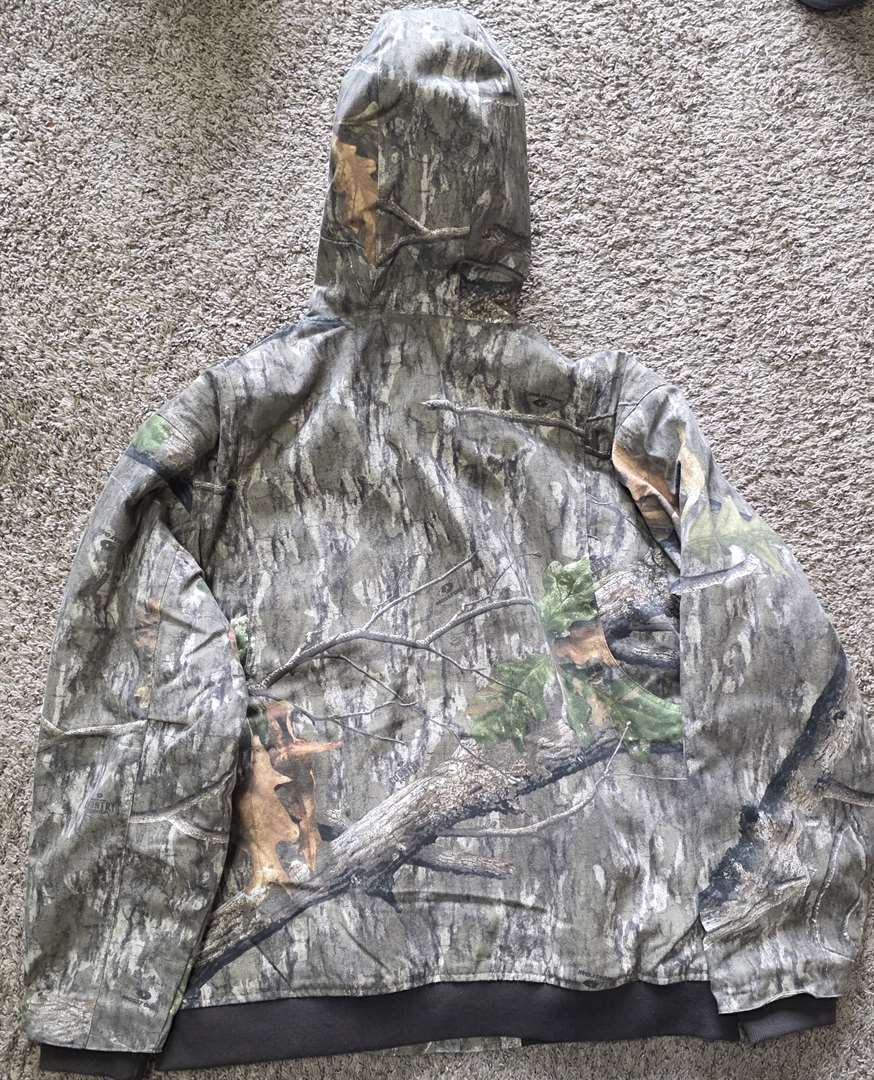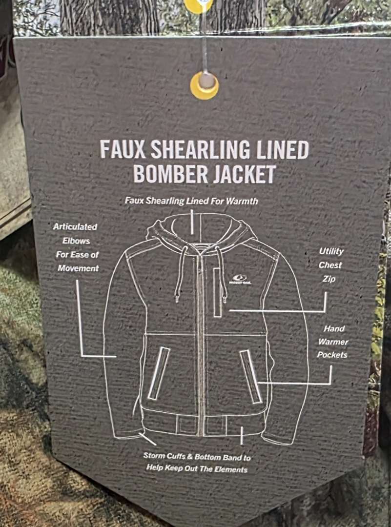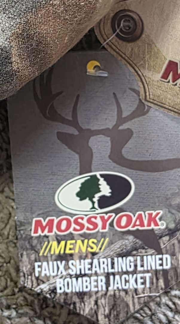 New-Mossy Oak Camo Bomber Jacket. Faus Shearling Lined for Warmth. Storm cuffs and Bottom Band to Help Keep Out the Elements. Sizes Available: 3XL, 2XL, XL Call or email me if interested