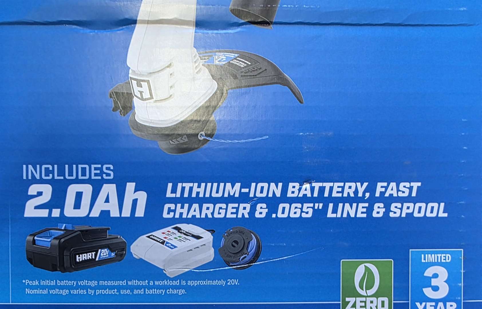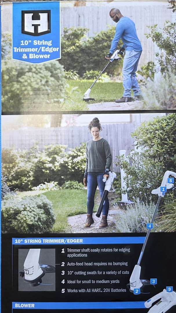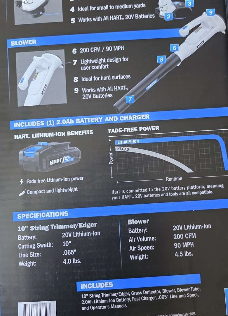 New-Hart Volt System. 10' String Trimmer/Edger and Blower. Blower has 200 CFM. Comes with 2.0Ah Lithium-ion Batter, Fast Charger, and .065' Line and Spool.