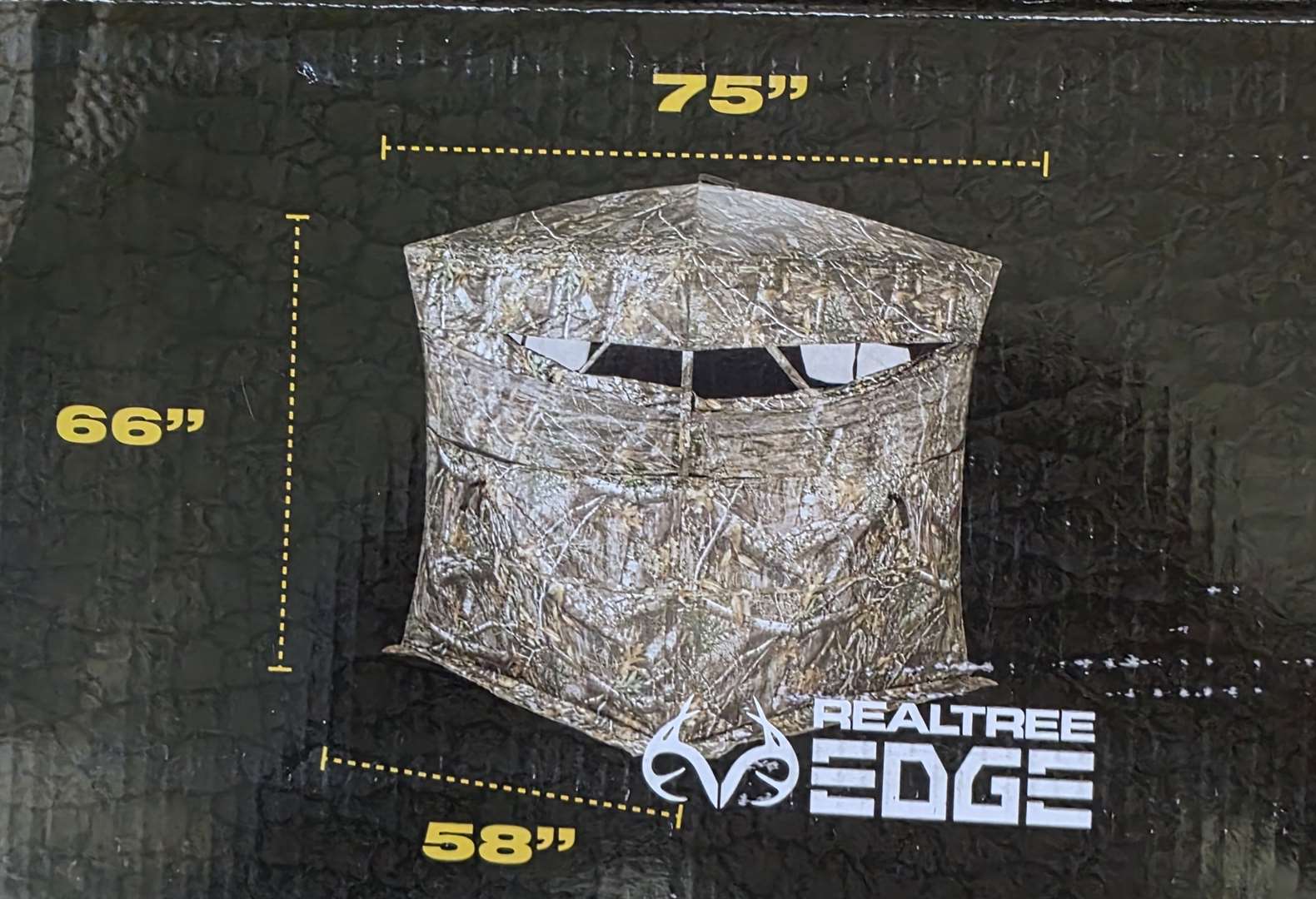 New-Real Tree Rhino 200 Edge Hunting Blind. Footprint 58" X 58" Weight 14 Lbs. Height 66" and Width 75".