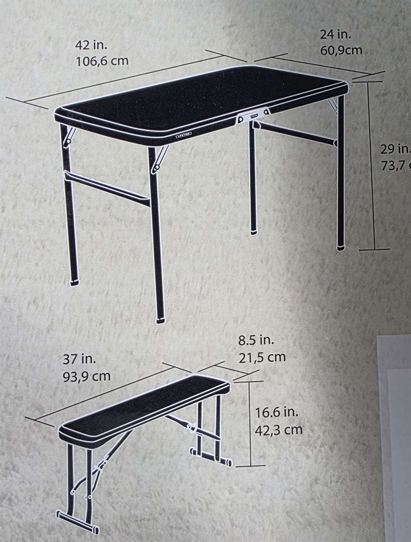 Lifetime Folding Picnic Table and 2 Each Folding Benches. Table is 42" Long and 24" Wide. Height 29". Bench is 37" Long x 8.5" Wide. Height 16.6".