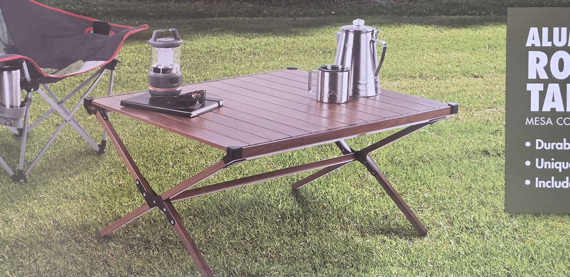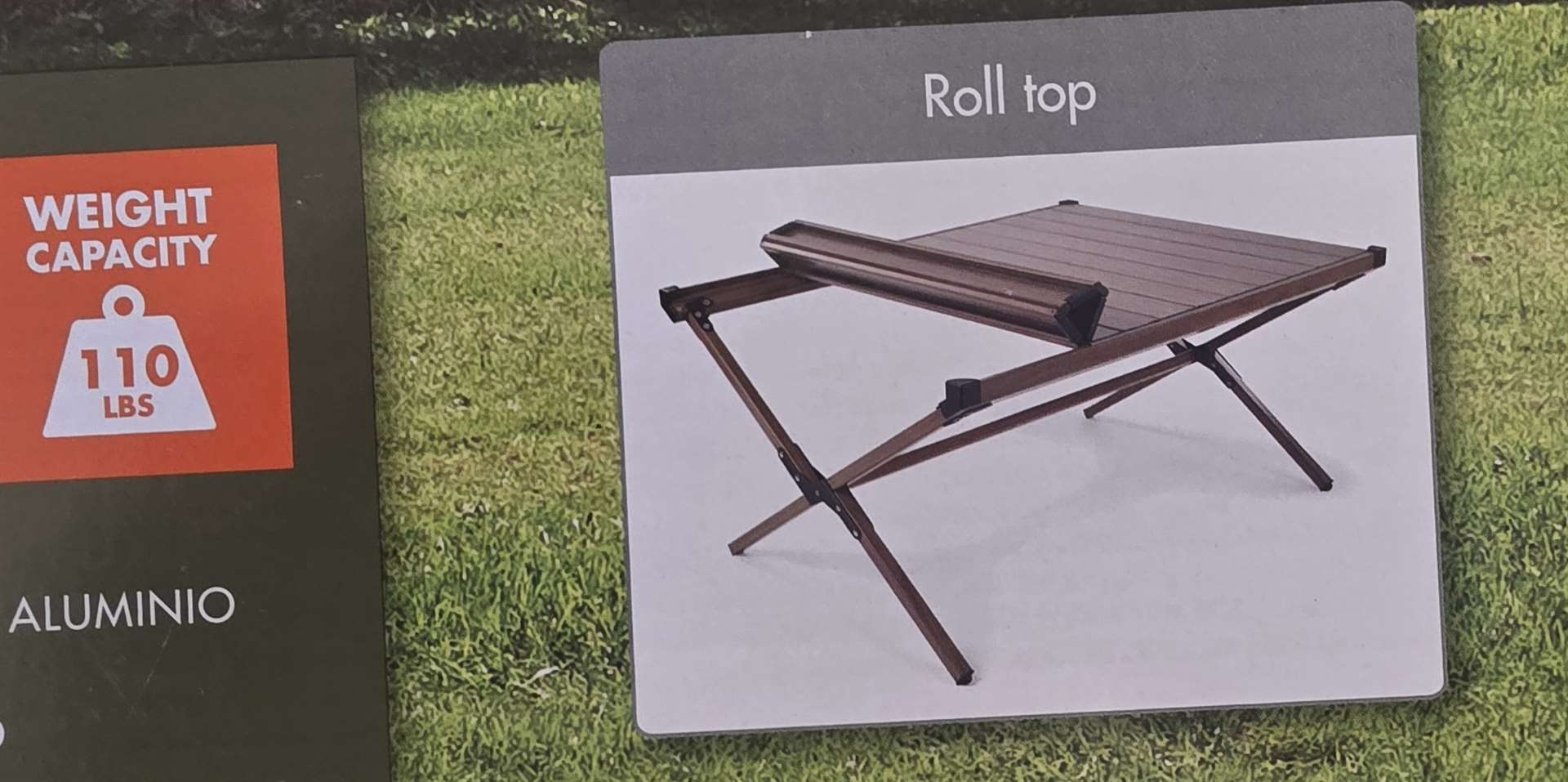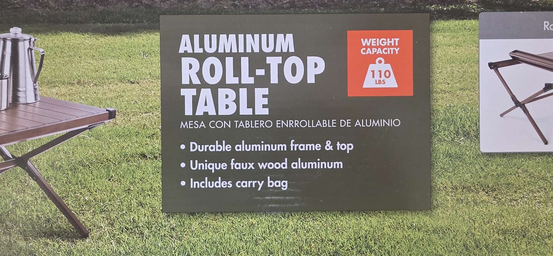 New-Ozark Trail Aluminum Roll-Top Table. 35 Inches W x 27.5 Inches D x 16.9 Inches H. Includes Carrying Bag. Great for Outdoor Camping, Picnics, Beach, Backyard, BBQ, and Party.