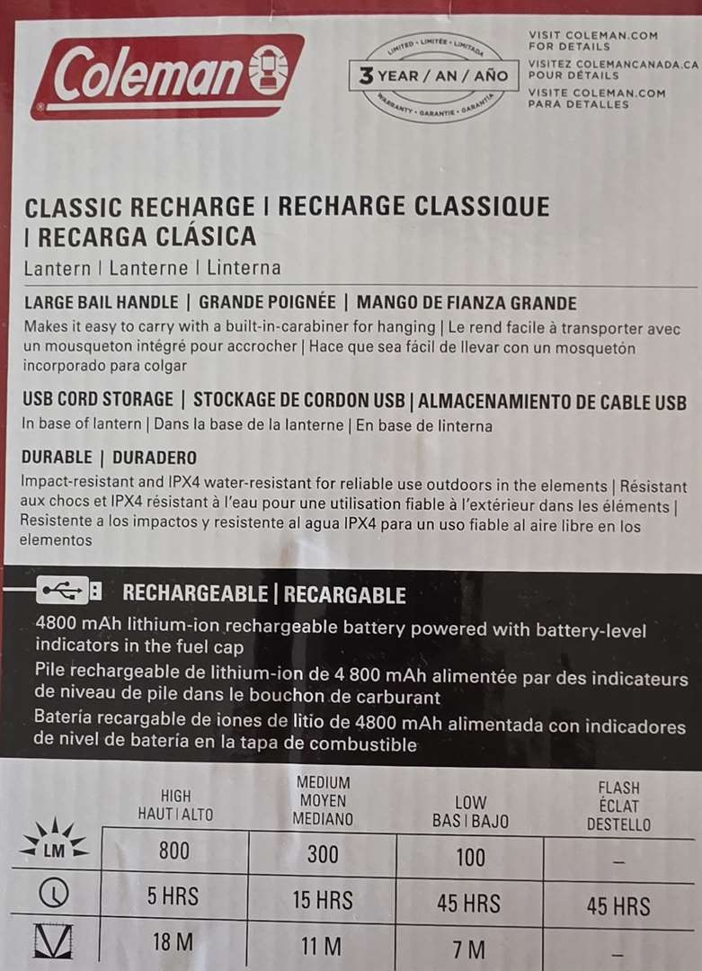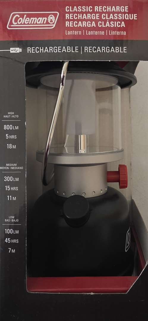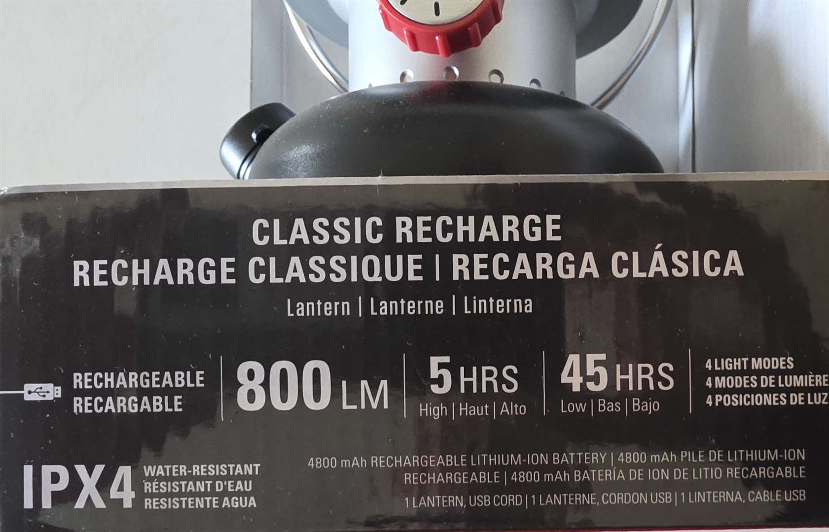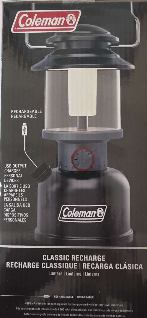 New-Coleman Lantern with USB Rechargeable Battery. 4800 mAh lithium-ion rechargeable battery powered with battery-level indicators in the fuel cap. High, Medium, Low and Flash settings.