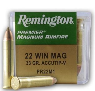 Remington Premier 22 Magnum 33 grain Accutip-V PR22M1 Ammo. $25 per 50 round box. This is premium .22 Magnum ammo so it isn't cheap. No purchase limits. Call 605-201-1822 Thanks!