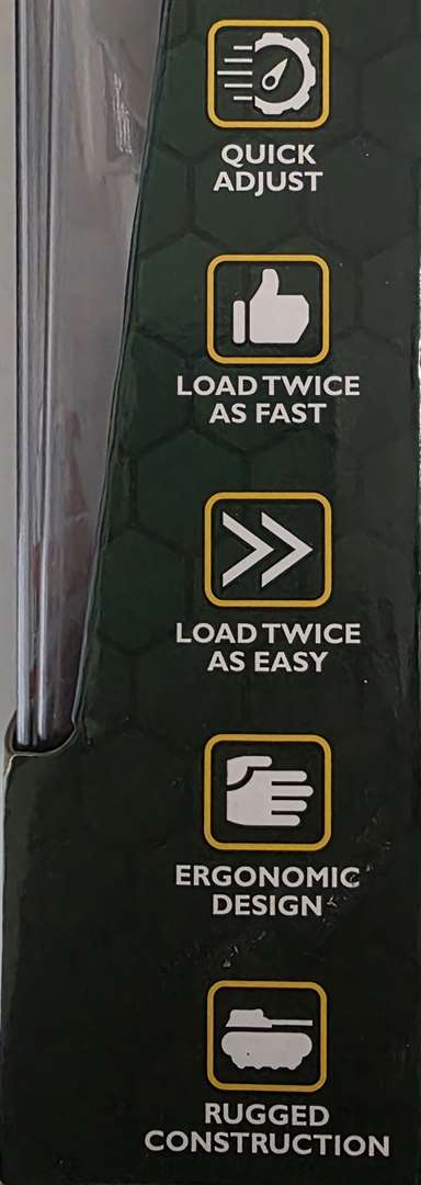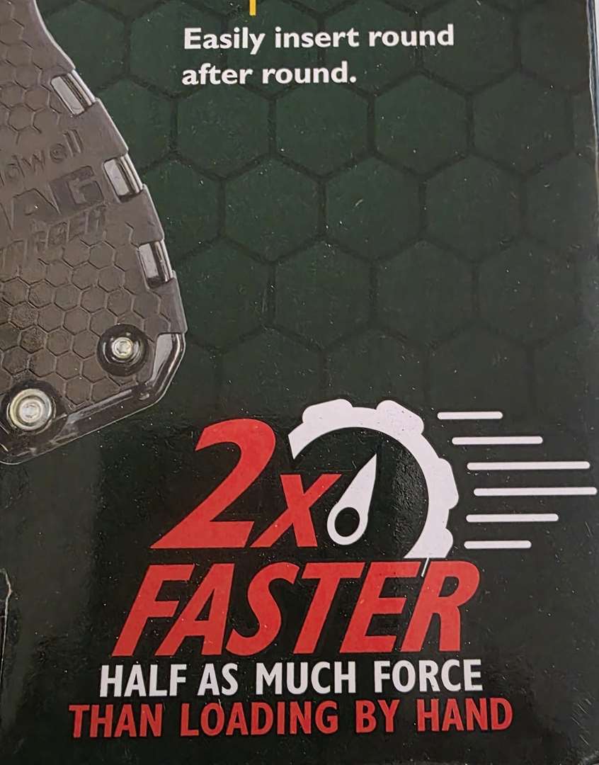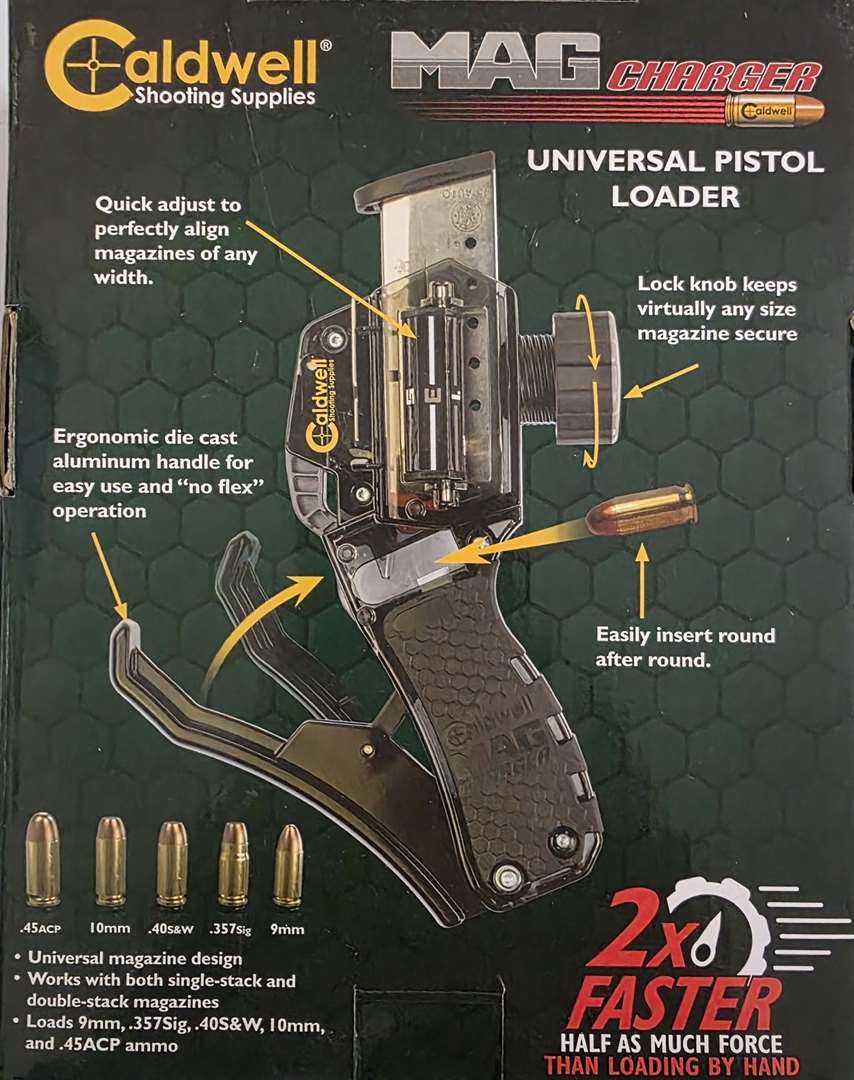 Caldwell Universal Pistol Loader. Loads 9mm, .357Sig, 40S&W, 10mm, and .45ACP ammo. 2x Faster Half as much Force than Loading by Hand.