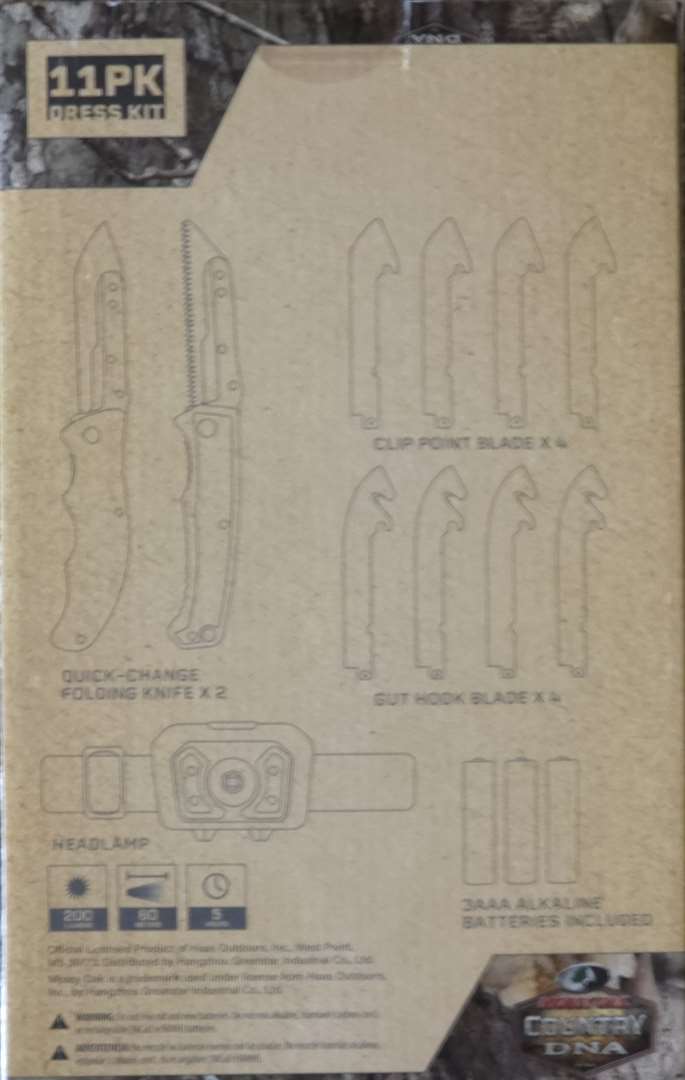 Mossy Oak 11 Pack Dress Kit with 2 Quick-Change Folding Knives. 4 Each Clip Point Blades, 4 Each Gut Hook Blades, a Headlamp, and 3 Each AAA Alkaline Batteries.