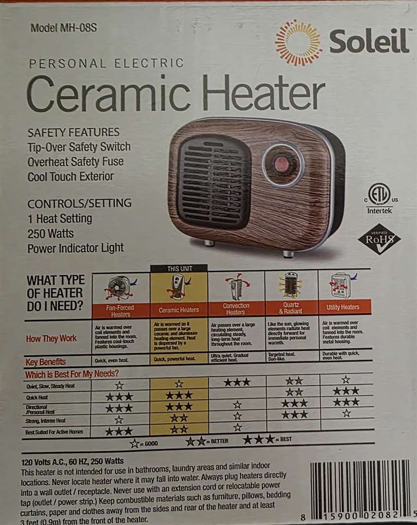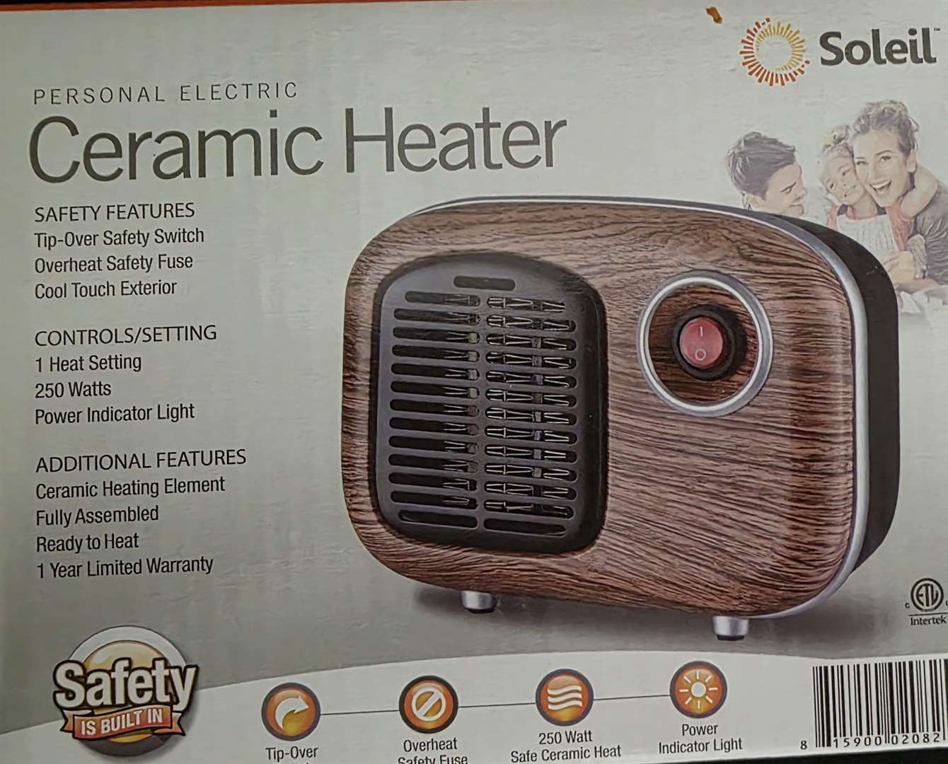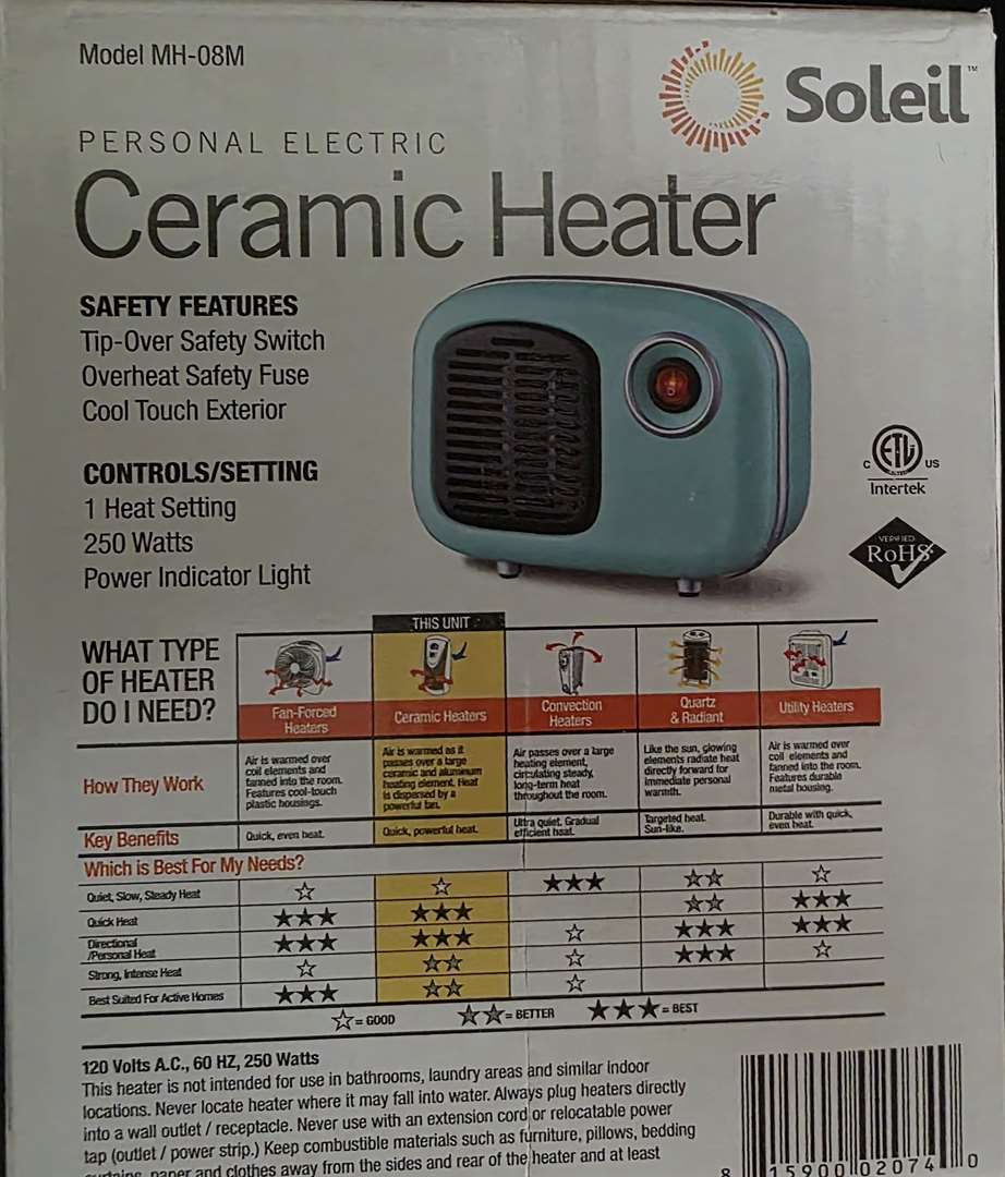 New Soleil 120V 250 Watts Small Personal Electric Ceramic Heater for Small Places. 1 Heat Setting with Power Indicator Light. $20 Each. If Interested Email me. Approximate: Length 7" Height 5 1/2' Width 4 1/2".