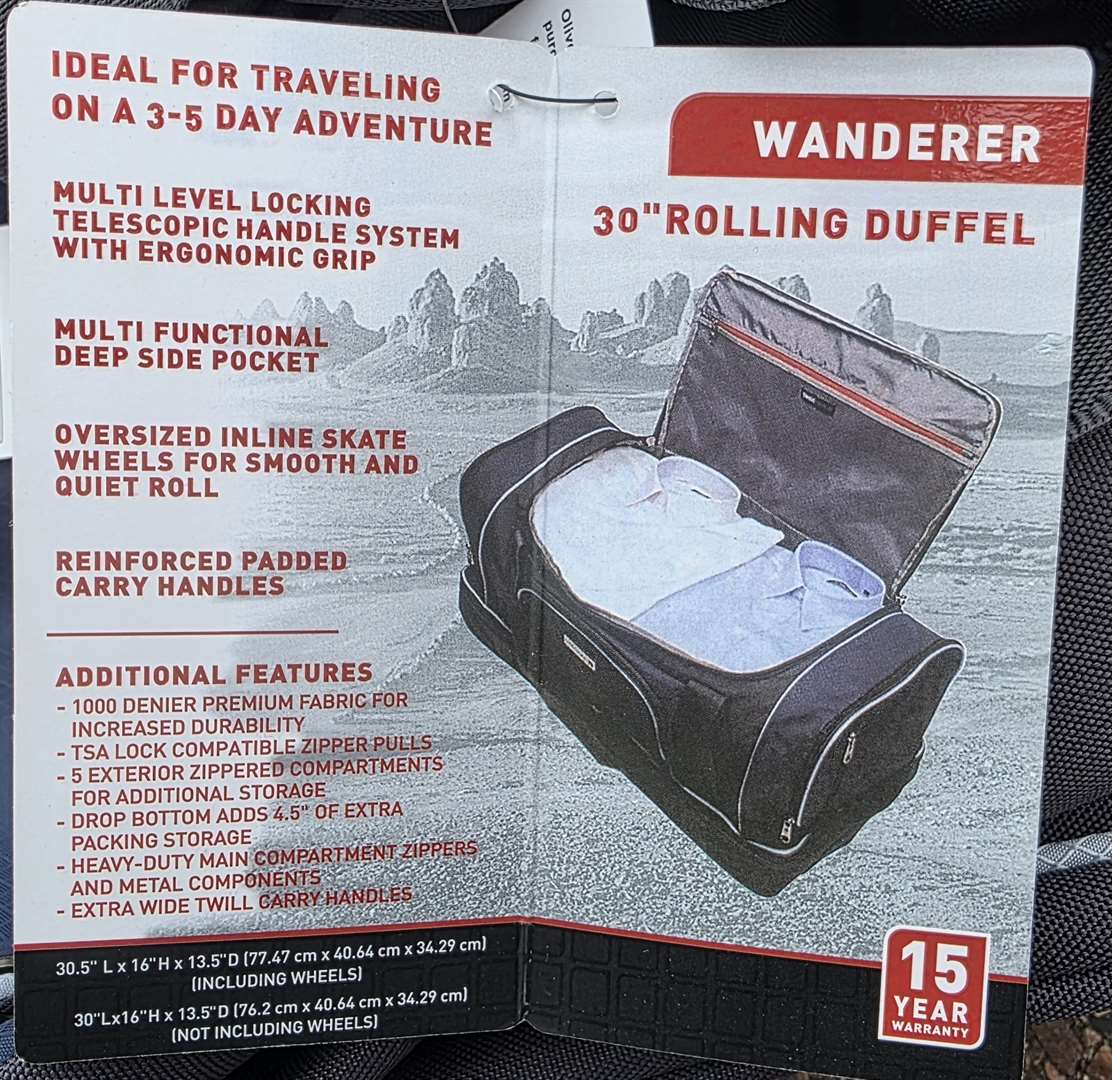Wander 30 Inch Rolling Duffle Bag. Ideal for Traveling on a 3-5 Day Vacation.30 Inch Length X 16 Inch Height X 13.5 Inch Diameter. If Interested Email me.