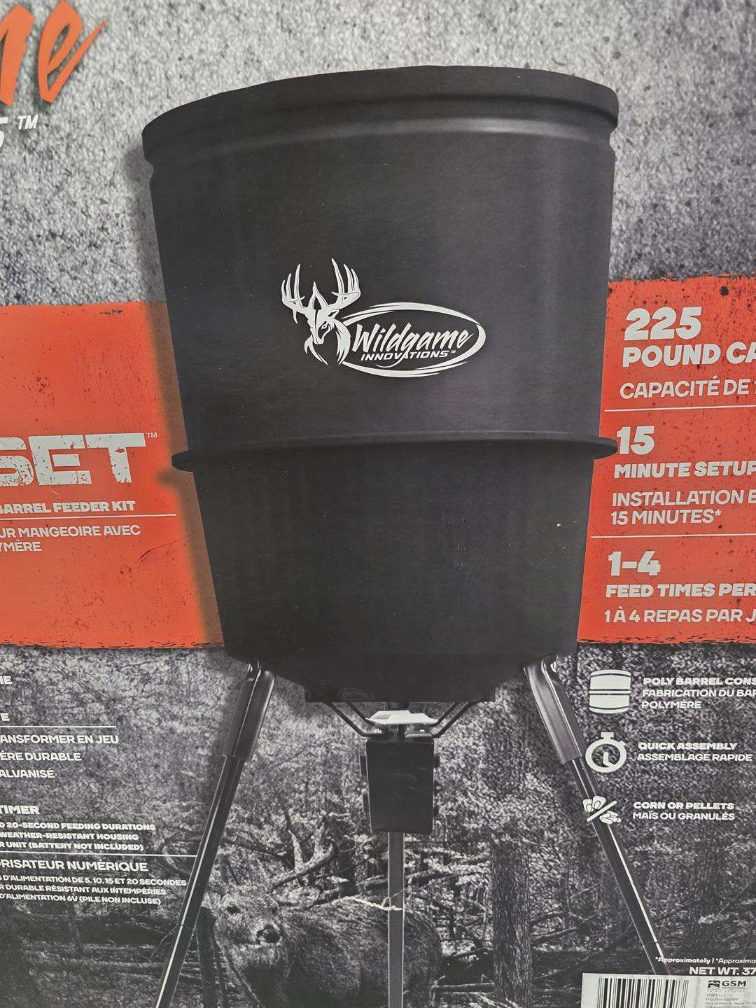 New Wild game Innovation Feeder. 225 Pound Capacity. 1-4 Feed Times Per Day. Poly Barrel Construction. Quick Assembly. Use Corn or Pellets. Additionally, I have added a 6-volt battery and 6/12 volt auto detect battery charger included.