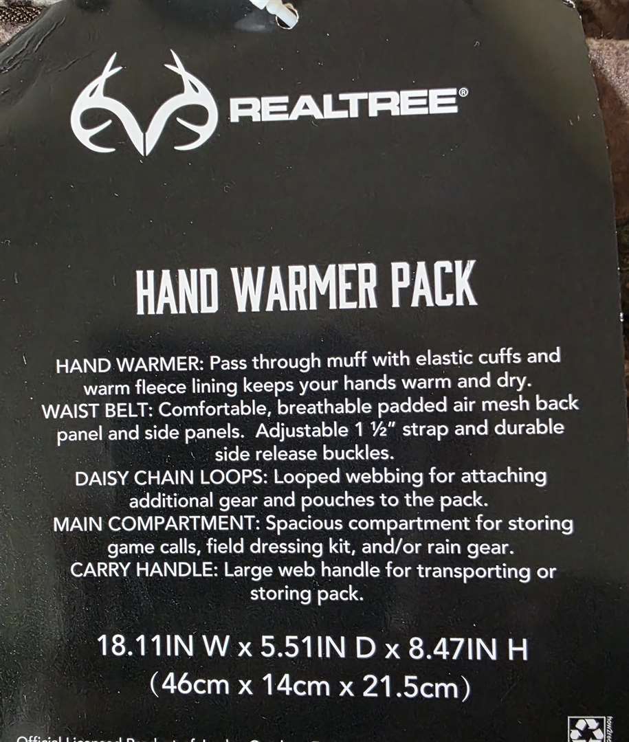 Real Tree Hand Warmer Pack: Pass through muff with elastic cuffs and warm fleece lining keeps your hands warm and dry. Main Compartment: for storing rain gear, etc. Call or Email me.