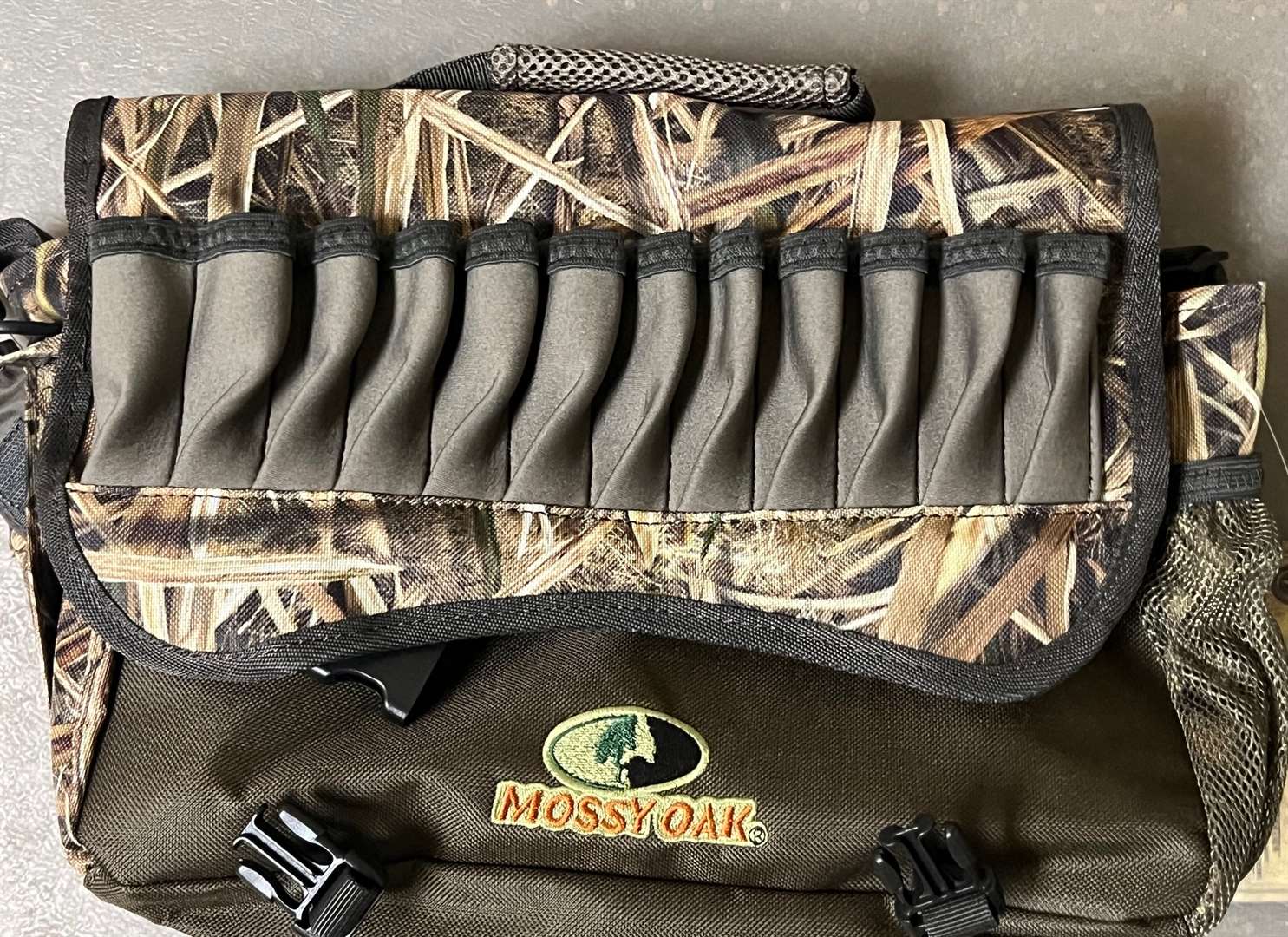 The item pictured is a Mossy Oak Quick Hit Timber Bag, a specialized container designed for waterfowl hunters to carry essential gear. Type: Messenger-style blind bag. Purpose: Organized storage for hunting calls, choke tubes, and other necessities. Design: Lightweight with multiple zippered pockets. Pattern: Features Mossy Oak camouflage for concealment in timber environments. New Nerver Used.